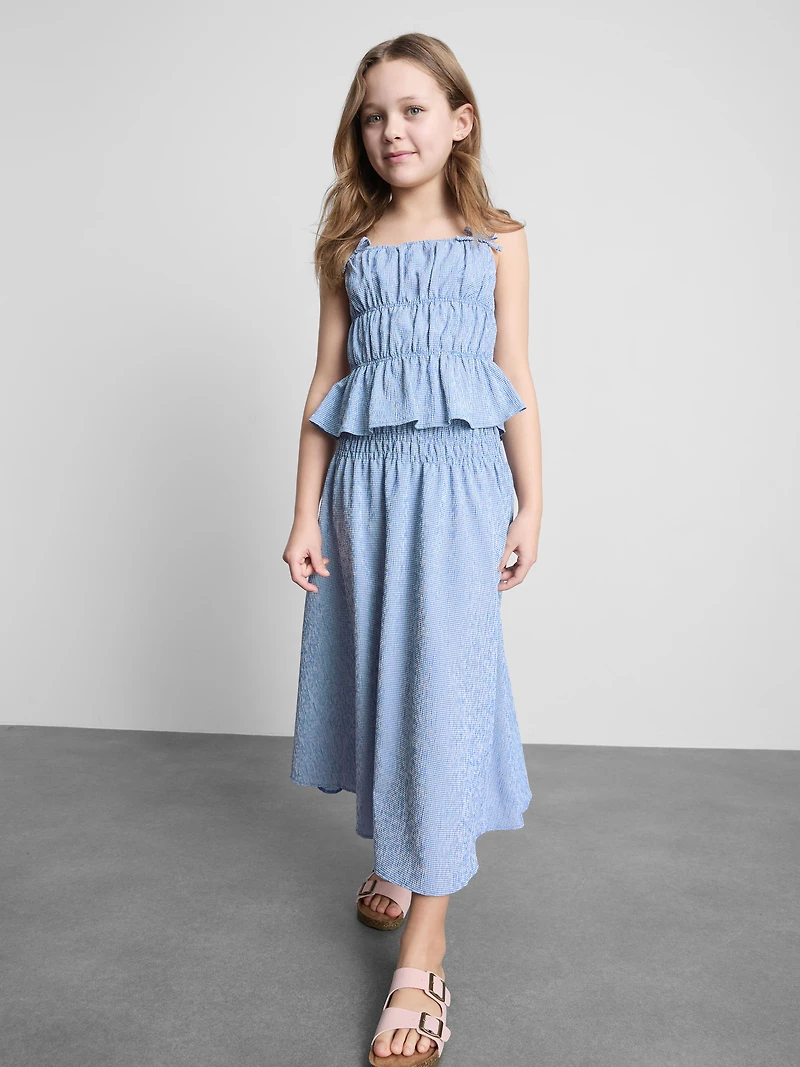 A midi skirt with a shirred waistband and an all-over gingham check pattern