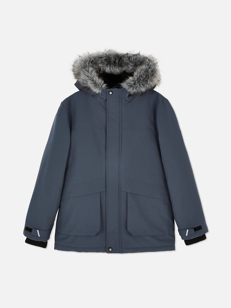 A parka jacket with a faux fur trim hood, concealed front fastening and patch pockets