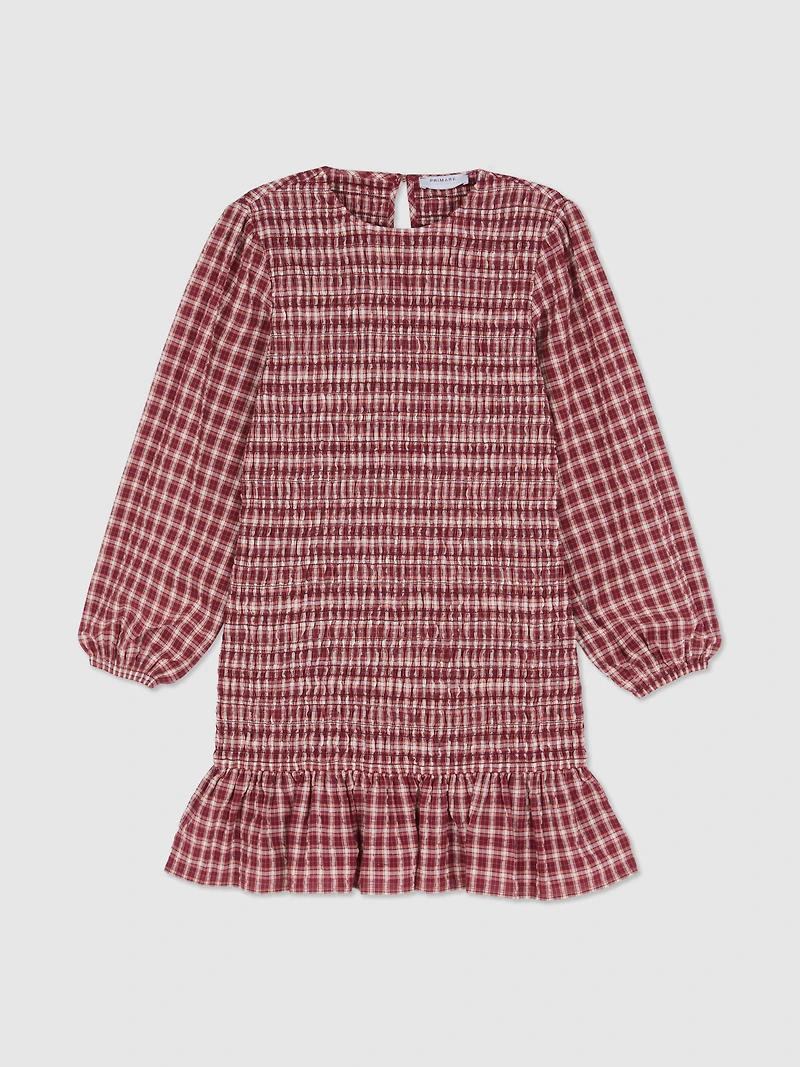 7-15yrs | Plaid Shirred Long-Sleeve Dress