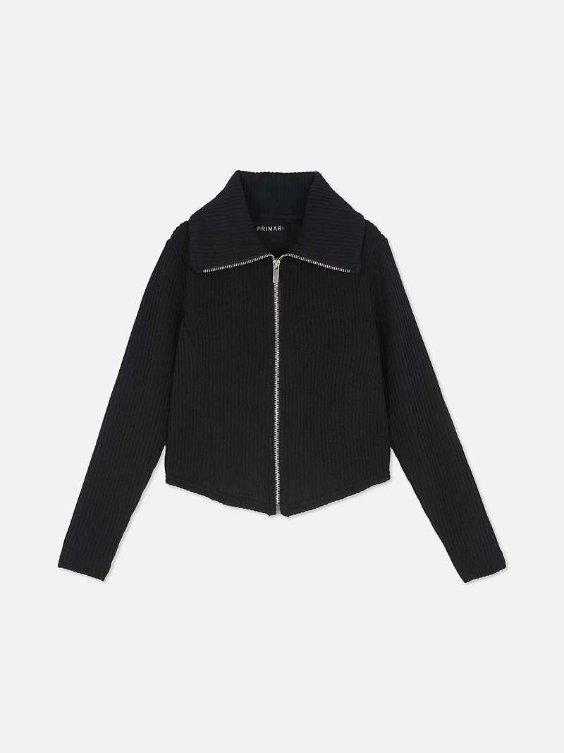 A zip-up collared sweatshirt in a rib fabric