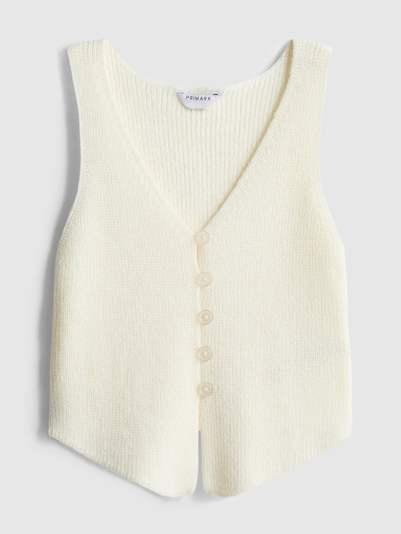 A knitted tank top with a V neck and button front
