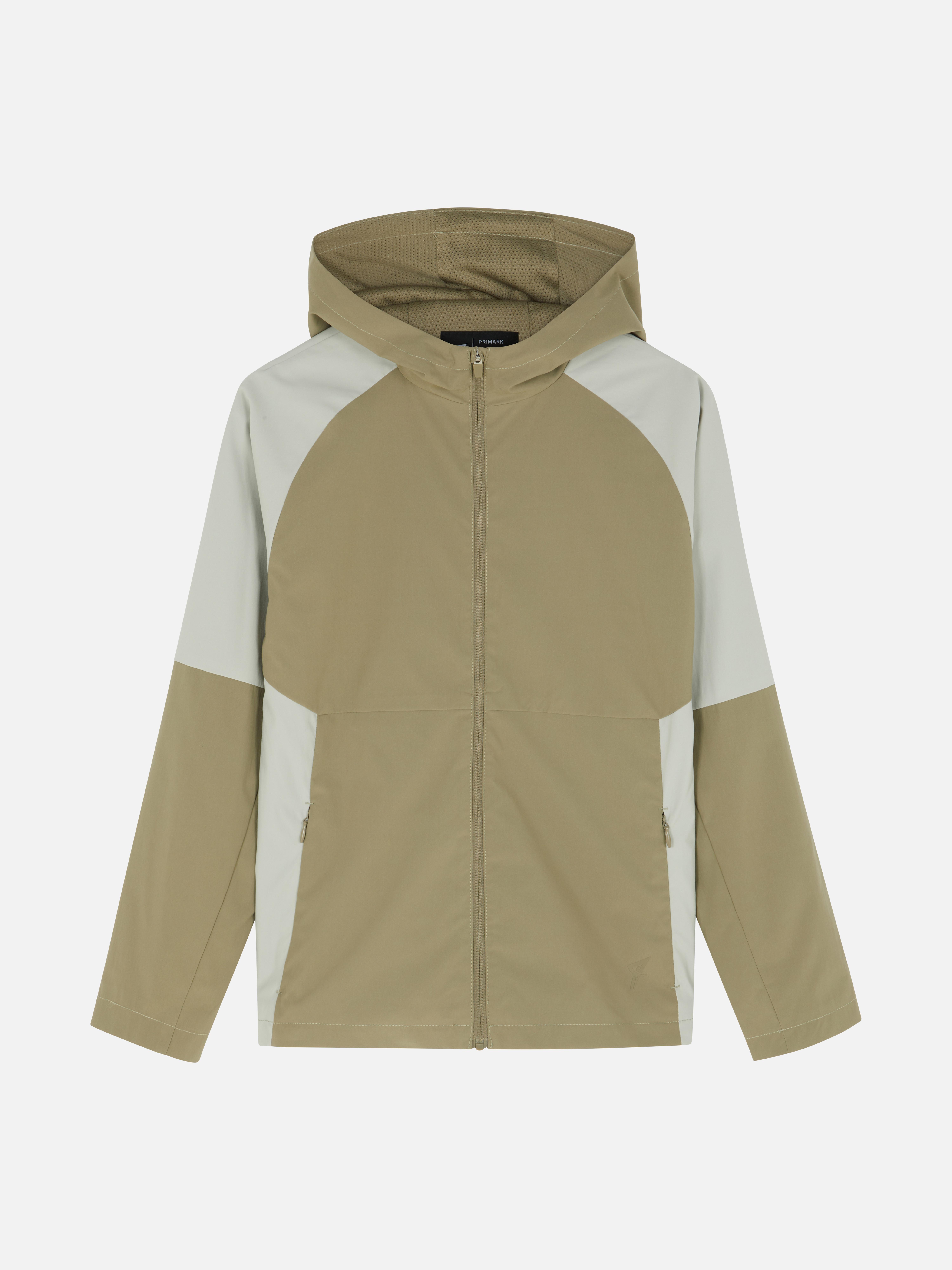 A hooded sports jacket with a zip front and zippered pockets