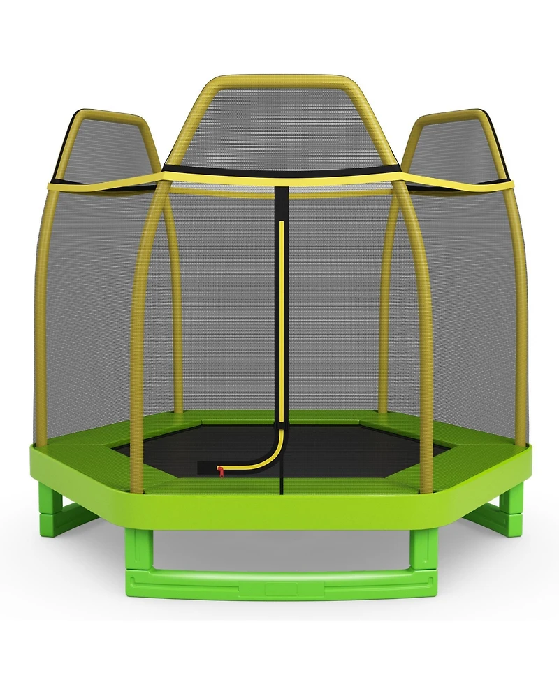 This 7ft trampoline provides a fun and safe bouncing experience for kids with high bounce performance and durable construction. Featuring a strong steel frame, breathable safety net, and foam-wrapped poles, it ensures safety. Easy to assemble, it s perfect for both indoor and outdoor use and helps improve balance and coordination.
