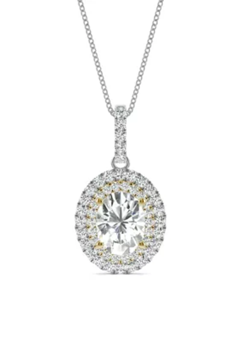 A prominent 8x6mm Charles & Colvard oval moissanite center stone surrounded by a halo of sparkling accents radiates from the center of this 14k two-toned gold pendant necklace. An elegant choice for sophisticated style. 47 Moissanite Lobster closure Color rating: G, I Color rating: SI-I2 Limited lifetime liability warranty Imported Product Specifications 18 in Length, 21.5 mm x 11.1 mm x 5.62 mm 7/8 ct. t.w. Lab Created Moissanite Material & Care Two-tone metal Spot clean