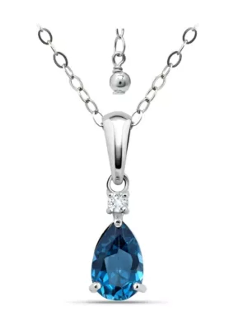 Genuine Pear London Blue Topaz & Round White Topaz Pendant set in Sterling Silver on Sterling Silver 16" Chain with 2" Extender Spring ring clasp, 2 Polished finish Prong setting Imported Belk Exclusive Product Specifications 3/4" X 1/4" .975cttw Material & Care Sterling silver Clean with a soft cloth.