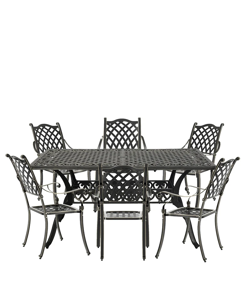 This 7pcs outdoor dining set includes 6 dining chairs and a 59 inchesx35 inches dining table, which can accommodate 6 people at the same time. The rust-proof cast aluminum with bronze appearance protects it from weather factors, making this dining table an excellent choice for outdoor leisure and dining.Cast aluminum material, waterproof and rust-proof, all-weather use, durable.Adopts hollow grid and exquisite pattern design appearance, beautiful and generous.Light weight, convenient to move and store, good in drainage and easy to maintain and clean.Adjustable non-slip foot pad, suitable for different terrain, stable and not shaking.Includes 6 patio dining chairs and a 59 inchesx35 inches rectangular table for 6 people.