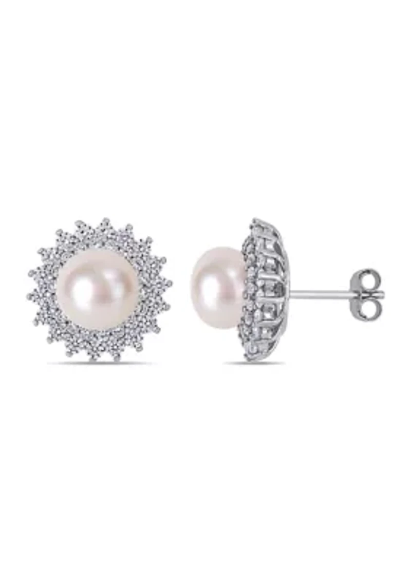 Dazzle with these stud earrings. Crafted in lustrous sterling silver, they feature 8.5-9mm white freshwater cultured pearls with 72 round-cut cubic zirconia stones in a unique floral halo design. 2 pearls, 72 cubic zirconia Post back earring Prong setting Polished finish 1-year warranty Imported Belk Exclusive Product Specifications 15.7 mm Height 1.62 ct. t.w. Cubic Zirconia Material & Care Sterling silver Spot clean only