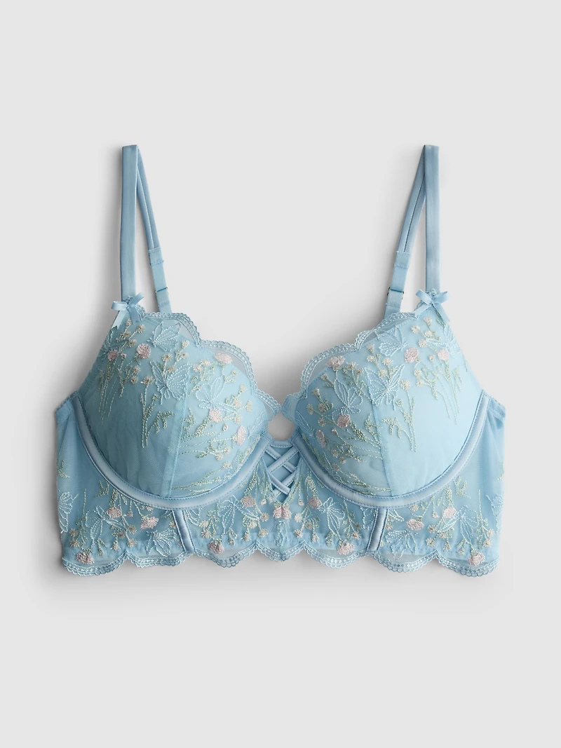 Embroidered butterfly push-up longline bra with underwire and adjustable straps