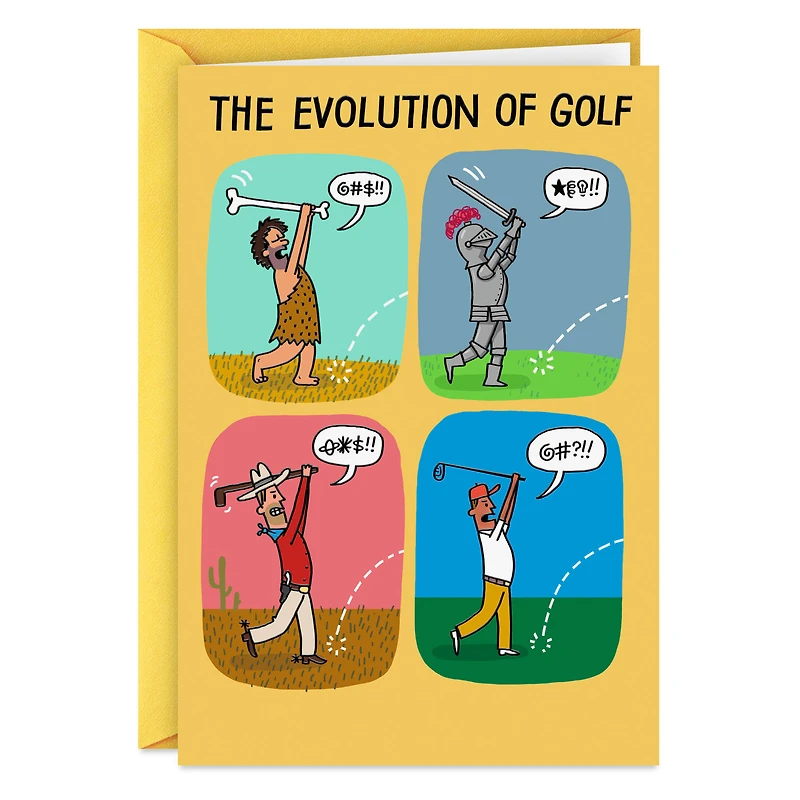 Funny birthday greeting card features illustrations of a prehistoric caveman swinging a bone, a knight clanking around in armor, a cowboy wielding his club in the wild west, and a modern golfer decked out in classic gear—all with an exasperated burst of symbols in a speech bubble. Raised accents.