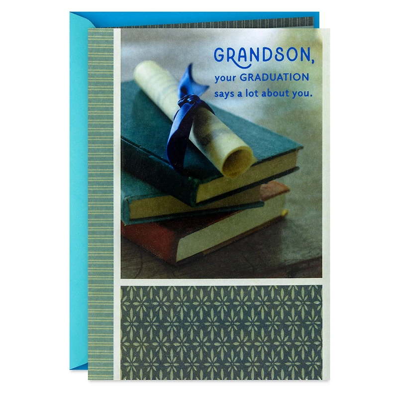 Graduation greeting card for your grandson features a rolled diploma atop a stack of books framed with a handsome geometric print border in blue and green hues. The heartfelt message of congratulations lets him know how proud you are of his achievements — and that he'll always be loved.