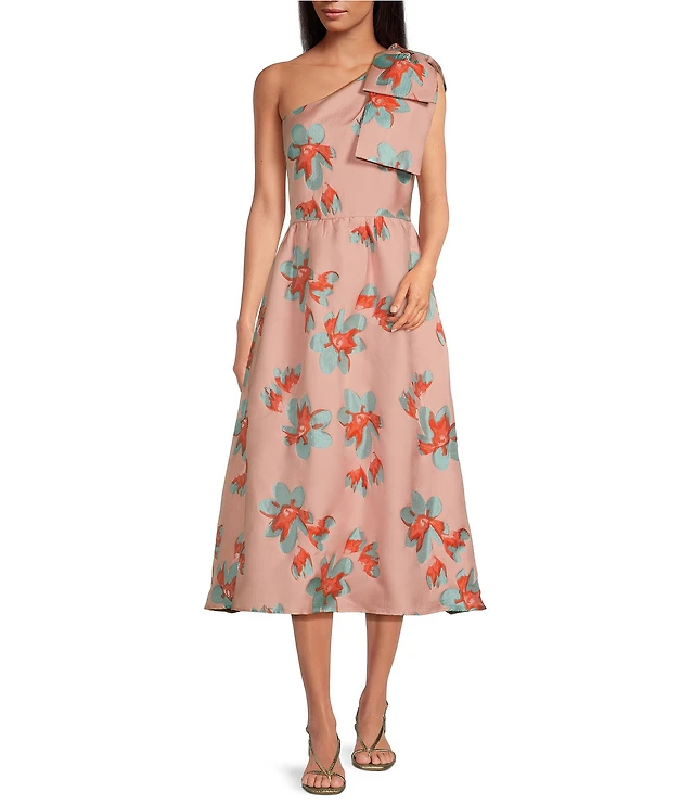 Abbey Glass Caroline Asymmetrical Neck Sleeveless Bow One Shoulder Bow Organza Jacquard Pocketed A-Line Dress