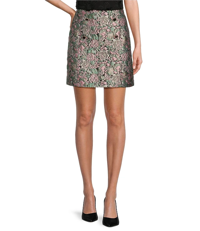 Abbey Glass Jessica Floral Jacquard High Rise Button Front Mini A-Line Coordinating Skirt