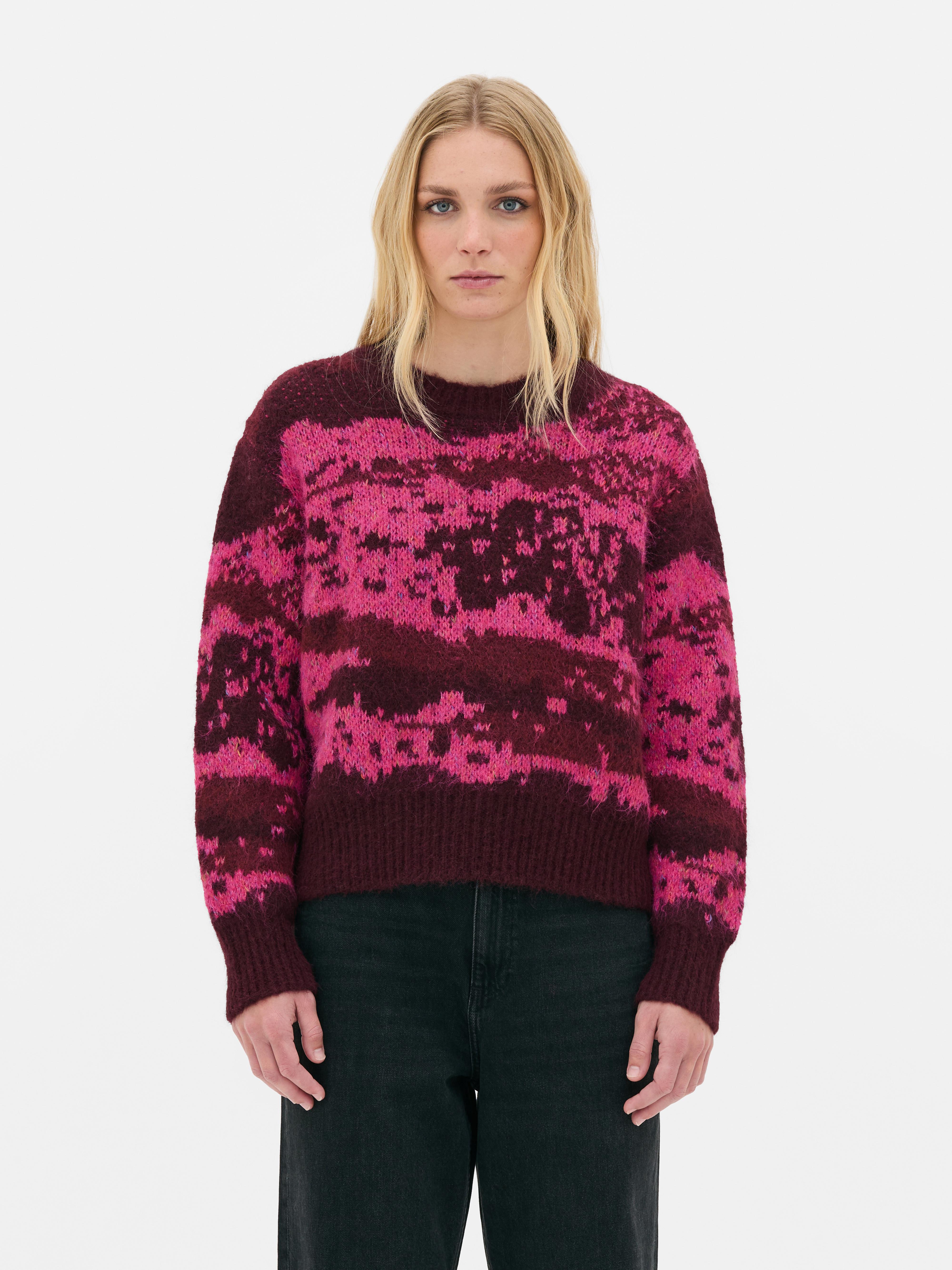 In a soft, cozy knit, this sweater has a crew neckline, long sleeves and an abstract design in shades of burgundy and pink