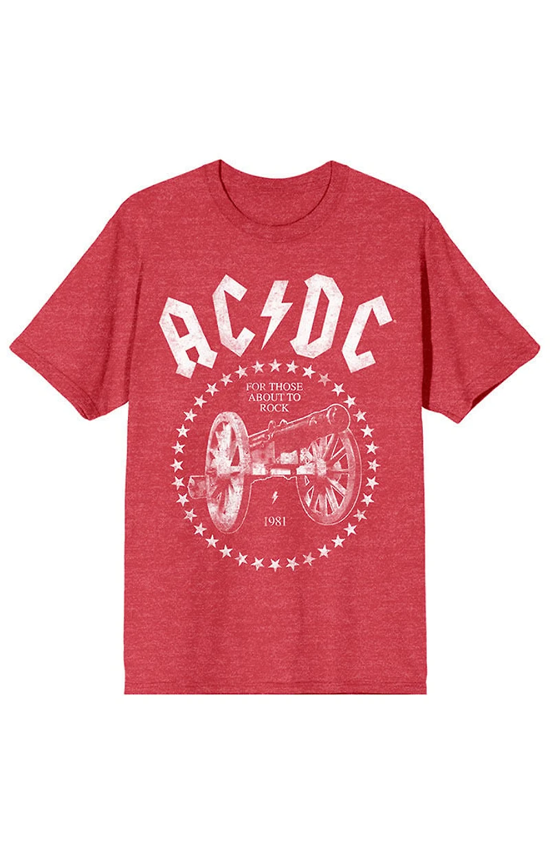 Rock out in style with this ACDC tee. The shirt features an image of a cannon in a circle of stars while the white text reads, "For Those About To Rock, 1981." The rock band's logo appears in white letters above the image. The tee comes in a red heather short-sleeved crew neck. ACDC fans will love this comfy t-shirt.