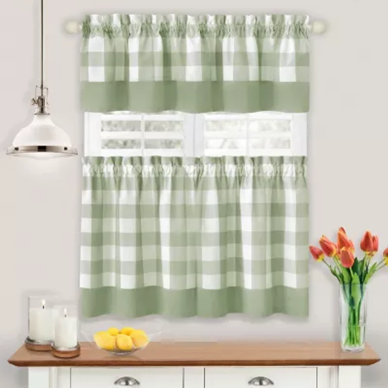 Out with the old in with the new, a modern farmhouse look is here with the hunter rod pocket window curtain tier and valance set. This large-scale check curtain set looks stunning and fresh in fun new colors. Expertly engineered so each piece will line up perfectly next to each other for a beautiful continuous check and a 4-inch solid colored trim. Add a decorator's touch by coordinating other windows in your room with the hunter rod pocket window curtain panel or a single valance, all sold separately. Each piece has a 1.5-inch rod pocket with a 1.5-inch header and available in different tier lengths. Machine washable poly-cotton fabric is easy to clean and drapes beautifully. Each set comes with one valance and two tiers; image shows the complete three-piece set. Single valance available separately. All colors in the hunter style perfectly coordinate with Achim home decor chase solid color chair pads, sold separately.