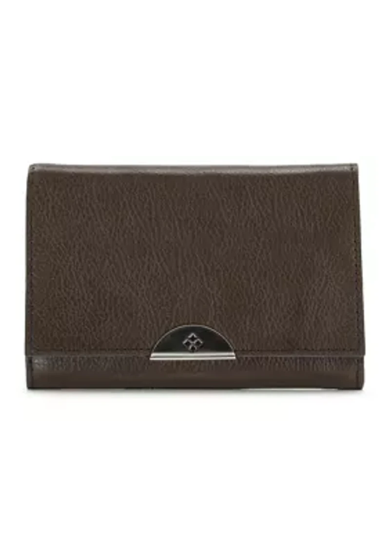 The Acri Wallet from Patricia Nash is a meticulously crafted trifold, perfectly sized to carry your essentials with effortless elegance and everyday practicality. Whether you carry it on its own, in a bag, or your pocket, you can't go wrong with the Acri. Exterior: 2 rear slip pocket with magnetic closure, deep embossed logo, burned edge finish Interior: 2 bill pockets, 4 slip pockets, 1 center snap coin pocket, 7 credit card slots, 1 ID window, leather trim, nylon lining Imported Product Specifications 19" W at top of bag, 14" W at bottom of bag x 12.5" H x 6" D Material & Care Leather trim Leather Wipe clean