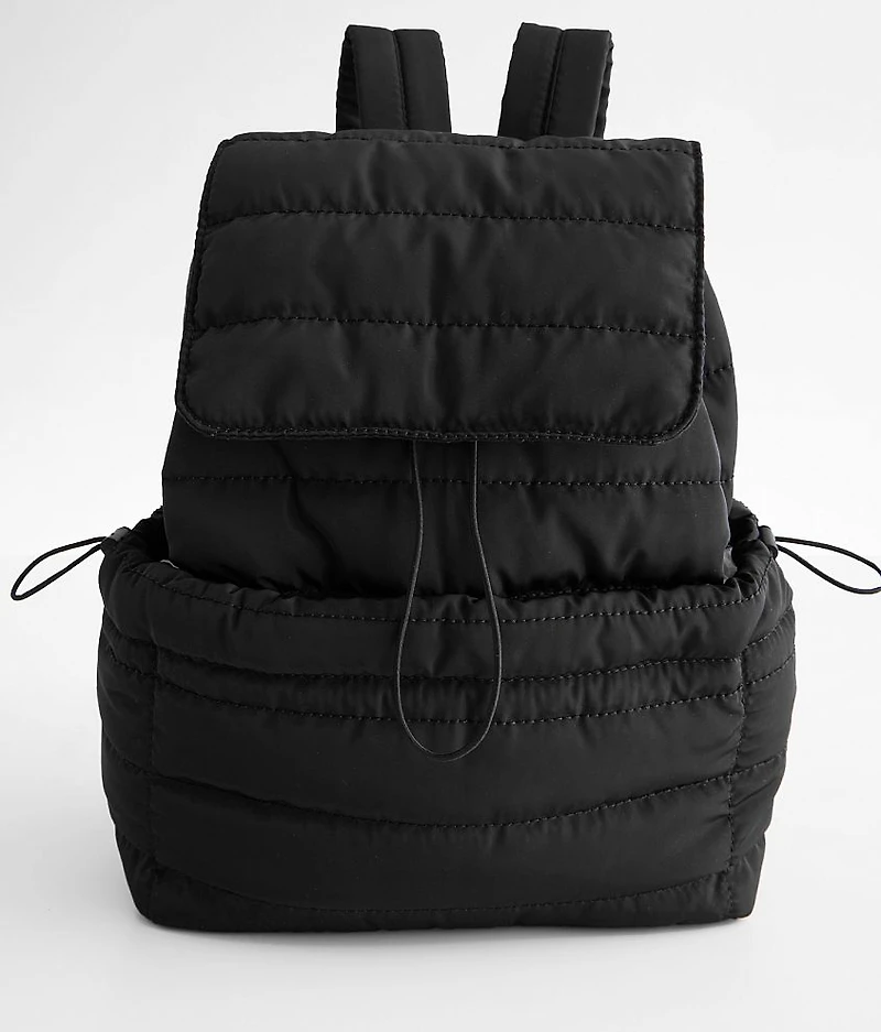 Lined backpack Foldover snap and cinch tie closure Interior pouch pocket Adjustable shoulder straps Dimensions: 11"(L) x 5"(W) x 13"(H)