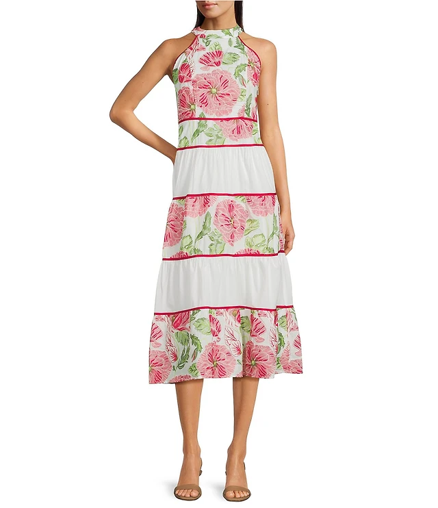 Adelyn Rae Haven Embroidered Floral Print Halter Neck Sleeveless Contrast Trim Midi Dress