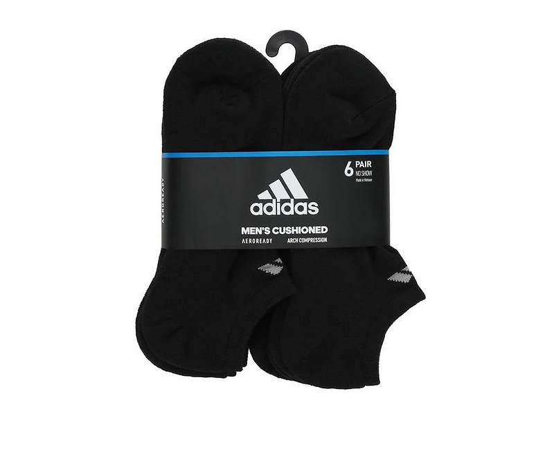 Adidas 6 Pair Men's Cushioned No Show Socks Keep active feet dry in these adidas men's socks. They have cushioning plus arch compression for a secure fit. The sneaker socks are built for durable everyday wear.