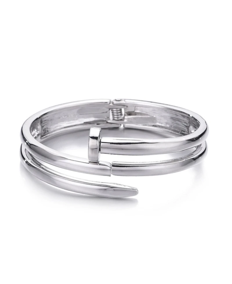 This silver plated cuff takes inspiration from industrial design with a sleek nail shape and a hinged opening for easy wear. It's bold without being bulky, making it a standout piece that fits comfortably on your wrist. Perfect if you want something a little different but still polished.
