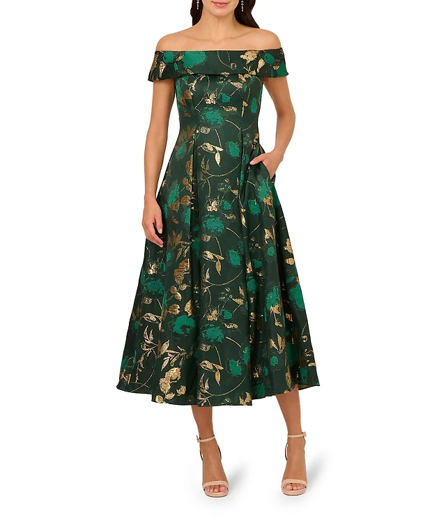 Adrianna Papell Jacquard Metallic Floral Print Off The Shoulder Midi Gown