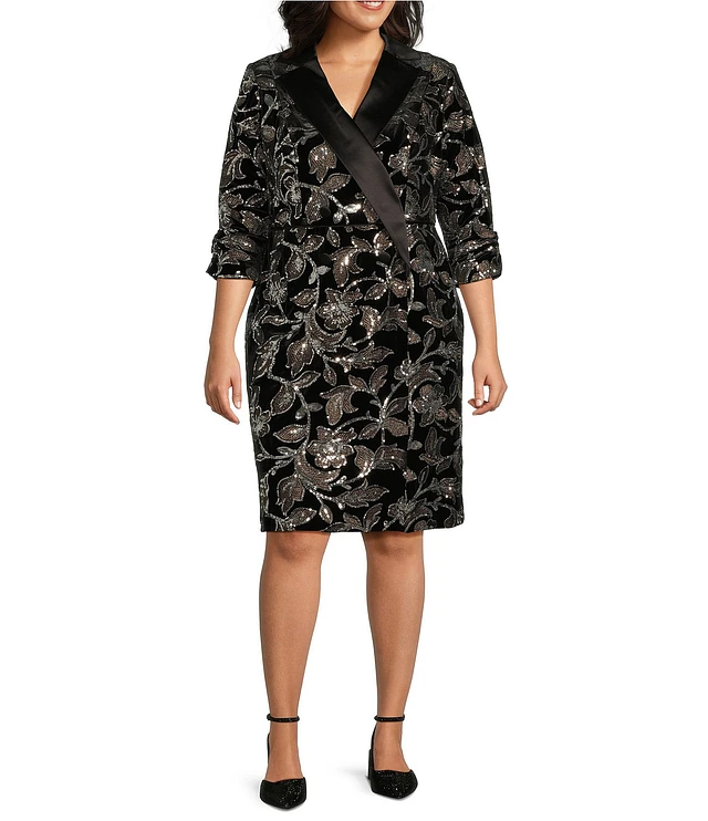 Adrianna Papell Plus Size Floral Print Velvet Surplice V-Neck 3/4 Sleeve Blazer Dress