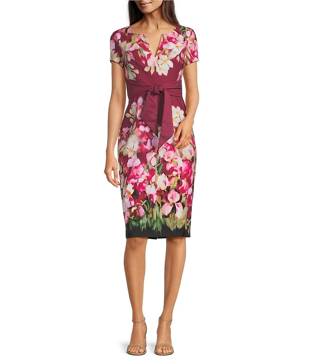 Adrianna Papell Short Sleeve Floral Print Tie Front Sheath Midi Dress