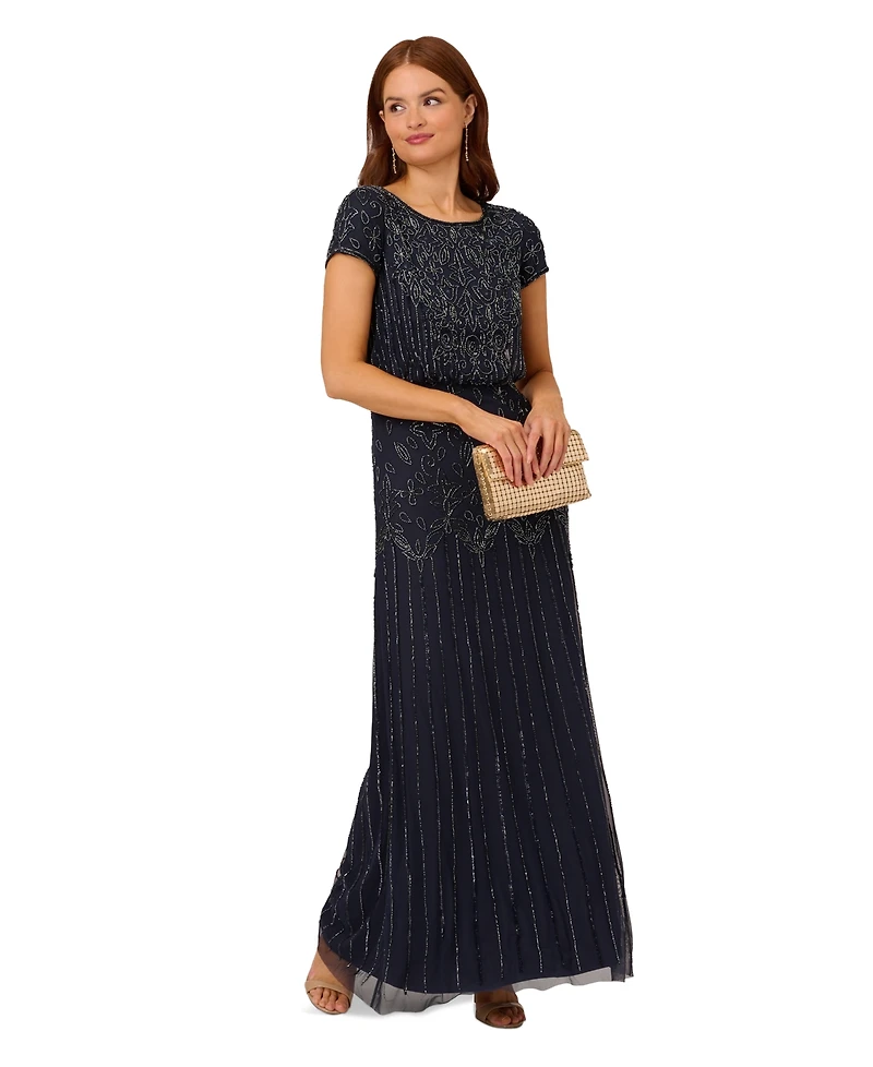 Delicate beading traces a beautiful motif across this short-sleeve gown from Adrianna Papell, featuring a flattering blouson waist.