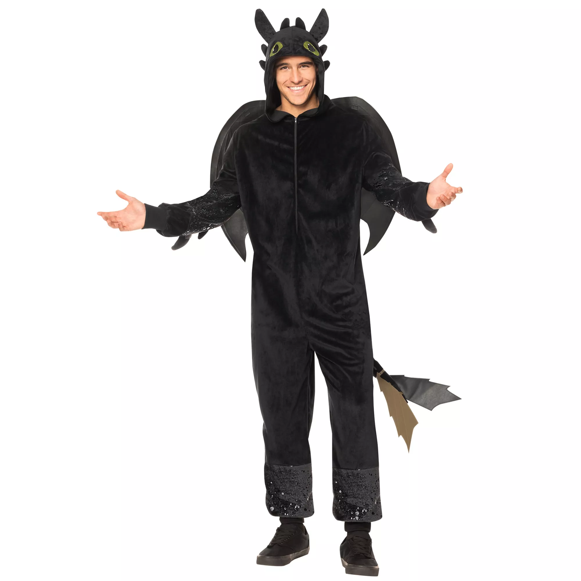 Look like the infamous Night Fury this Halloween when you dress up in this officially licensed Toothless Costume! If How to Train Your Dragon is your favorite movie, this hooded costume with attached wings and tail is perfect!