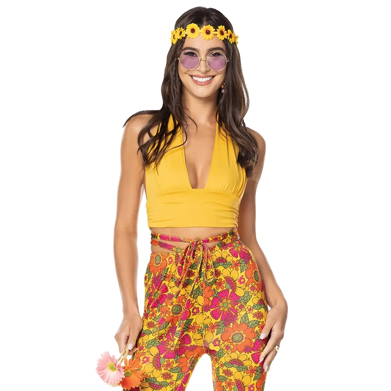 Complete your groovy look in this golden yellow halter top! This easy-to-style halter top features a plunging V-neck design that ties at the back of the neck. With plenty of stretch, this top lets you dance all night in comfort and style.