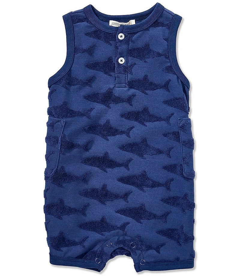 From Adventurewear 360, this romper features: Allover shark print Crew neck Sleeveless 3-5 inches Snap leg closure Cotton/polyester Machine wash/tumble dry Imported.
