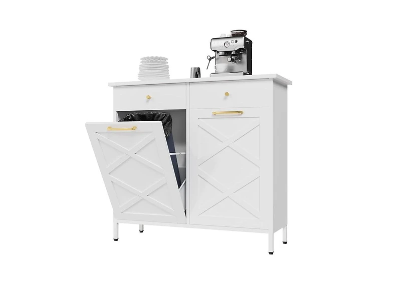 Declutter in style with the hidden trash cabinet that does it all. Discreetly store two 20 gallon bins behind a sleek barn door front-stopping odors and pets in their tracks. Built with a sturdy, rust resistant metal frame and a 110 lb rated top for small appliances, this versatile unit also doubles as a laundry hamper or recycling center. Blends seamlessly into farmhouse or modern kitchens and assembles in about an hour for instant organization.