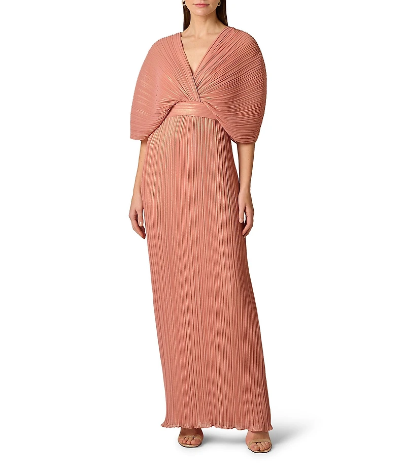 Aidan Mattox Pleated Foiled Chiffon V-Neck Dolman Sleeves Long Dress