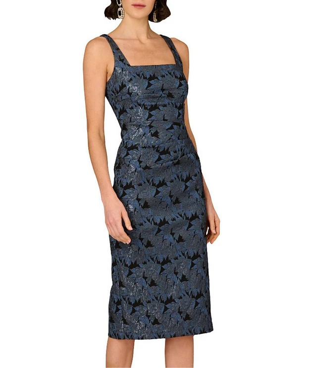 Aidan Mattox Stretch Jacquard Square Neck Pleated Sheath Midi Dress