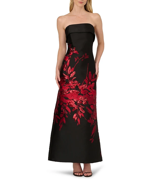 Aidan Mattox Strapless Pleated Waist Floral Printed Jacquard Sheath Gown
