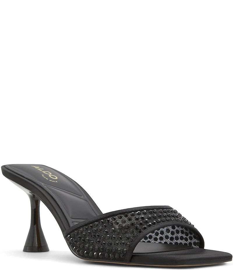 From ALDO, the Agatha Rhinestone Slide Dress Sandals feature: Mesh fabric upper with allover rhinestones Square toe construction Slip on design Unlined Pillow Walk: Designed with dual density foam and a padded insole for extra comfort Rubber outsole Approx. 2.75" heel height Imported.