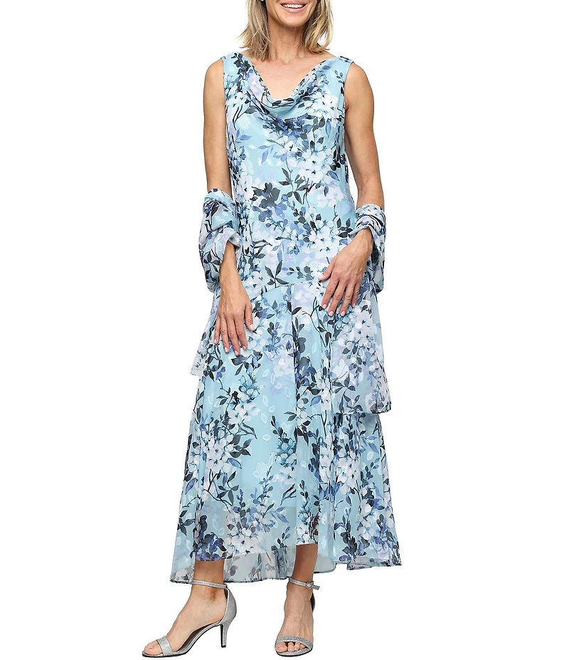 From Alex Evenings, this dress features: Chiffon fabrication Cowl neckline Sleeveless Lined Floral print Shawl included Center back zipper closure Approx. 43" in length Polyester Hand wash cold Imported.
