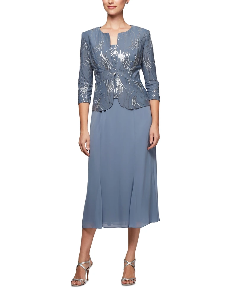 Chiffon and sequins set the tone on this beautiful duo by Alex Evenings, a midi-length dress and matching jacket for cooler nights.