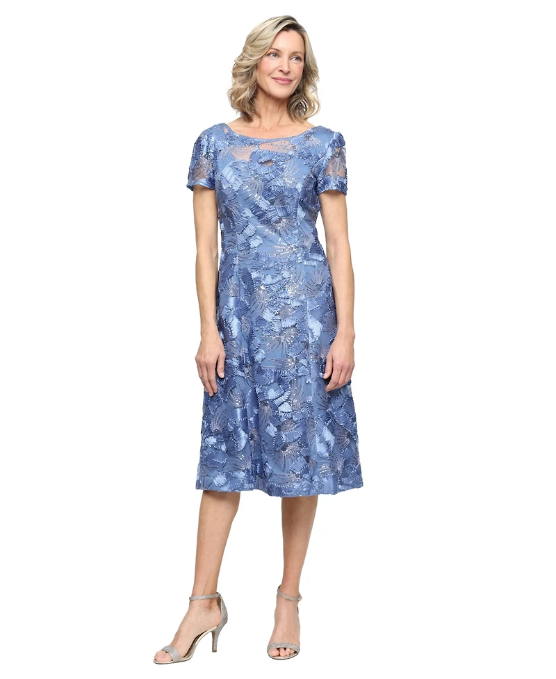 Combining delicate lace with elegant details, this Alex Evenings Tea-Length A-Line Soutache Lace Dress features illusion cap sleeves and sequin accents. The boat neckline and back zipper closure ensure a sophisticated, formal silhouette.
