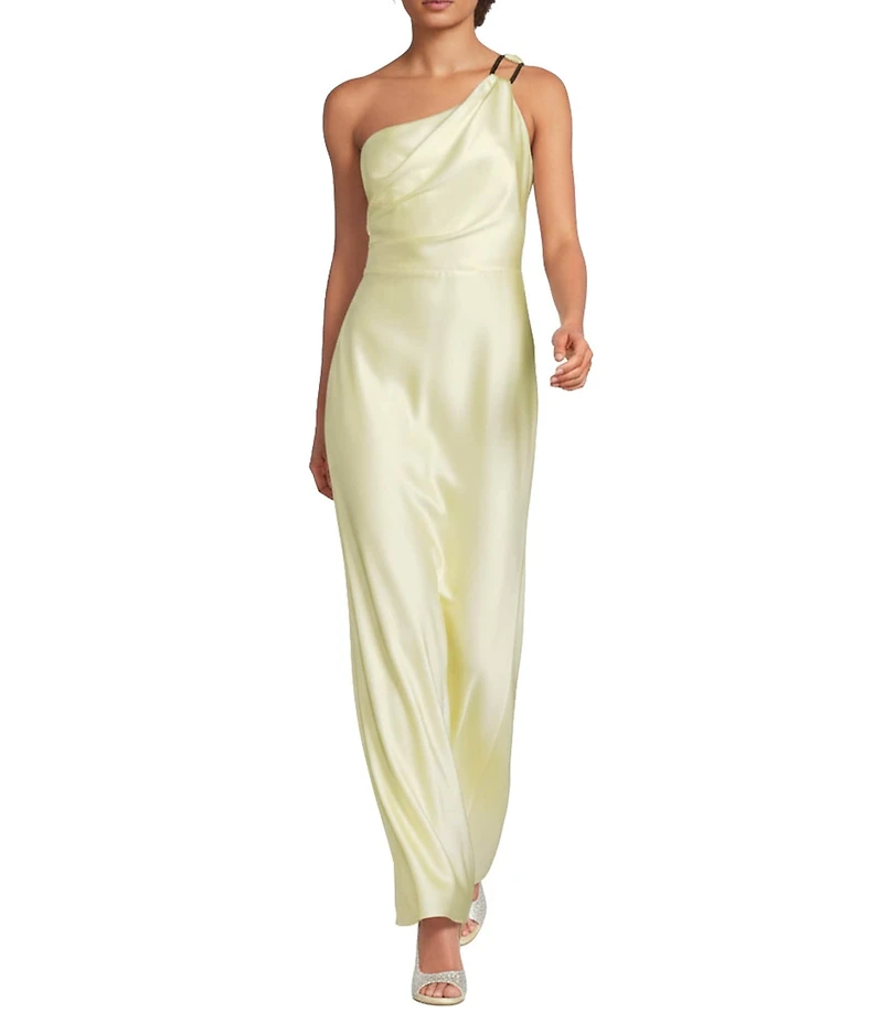 From Alex Marie, this dress features: Stretch satin fabrication Asymmetrical neckline Sleeveless Invisible zip hook and eye side closure Approx. 58.5" length Polyester/elastane fiber content Polyester/elastane lining Dry clean Imported. Dillard's Exclusive.