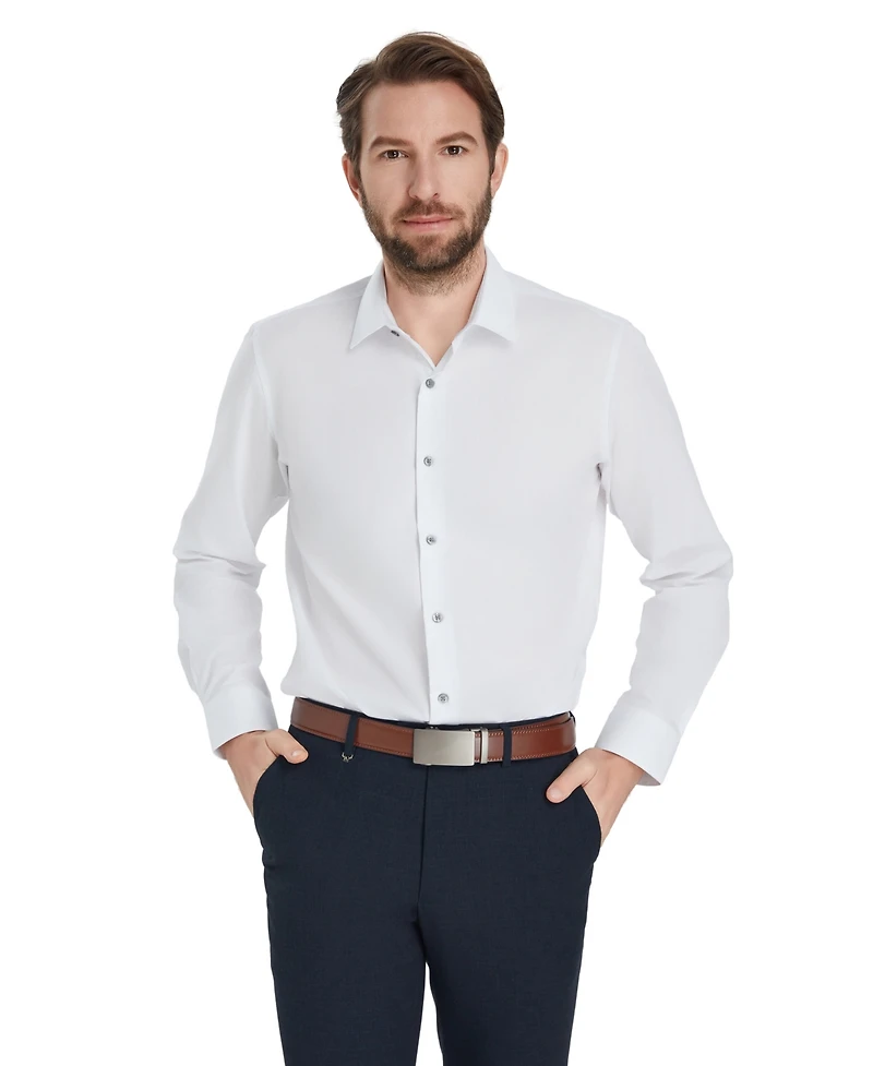 Command modern polish in this Alfani dress shirt tailored with a Slim-Fit and sharp spread collar. Mitred cuffs and easy-care fabric support effortless style within its solid, refined design.