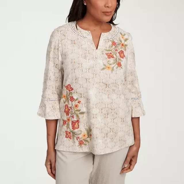 Alfred Dunner Copper Canyon Womens Split Crew Neck 3/4 Sleeve Embroidered Blouse