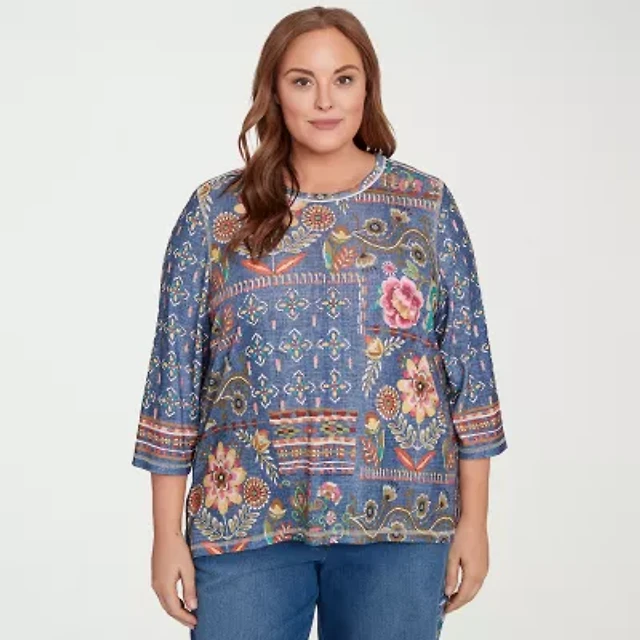 Alfred Dunner El Paso Womens Plus Crew Neck 3/4 Sleeve T-Shirt