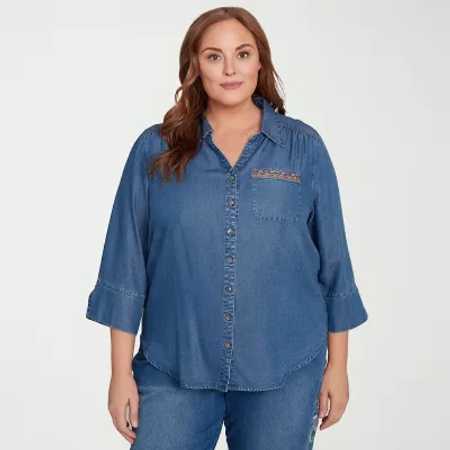 Alfred Dunner El Paso Womens Plus Cuffed 3/4 Sleeve Embroidered Button-Down Shirt