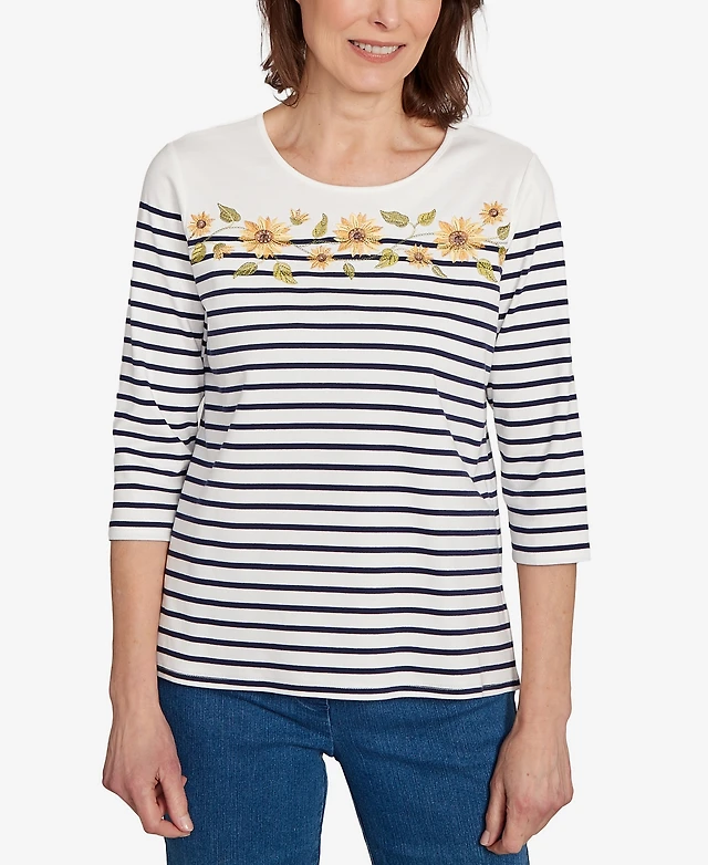 Alfred Dunner Petite Classic Floral Embroidered Stripe Top with Necklace