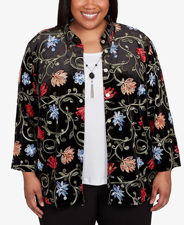 Alfred Dunner Plus Size Jet Setter Rich Velvet Floral Two in One Top with Necklace