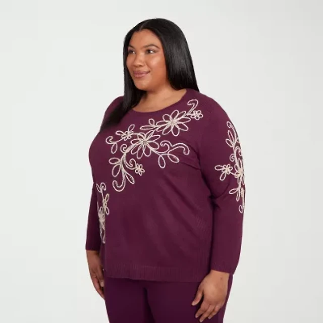 Alfred Dunner Plus Urban Legend Womens Crew Neck Long Sleeve Floral Pullover Sweater