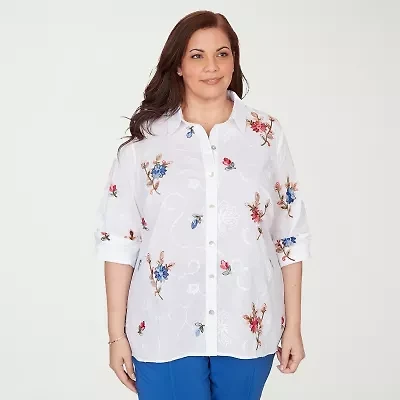Alfred Dunner Womens Plus Cuffed 3/4 Sleeve Embroidered Button-Down Shirt