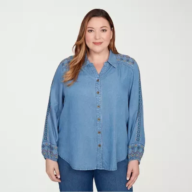 Alfred Dunner Womens Plus Cuffed 3/4 Sleeve Embroidered Button-Down Shirt