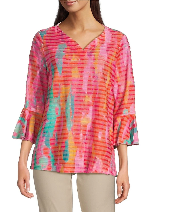 Ali Miles Knit Printed V-Neck 3/4 Bell Cuff Sleeve Tunic